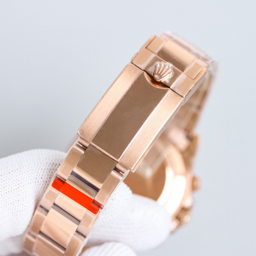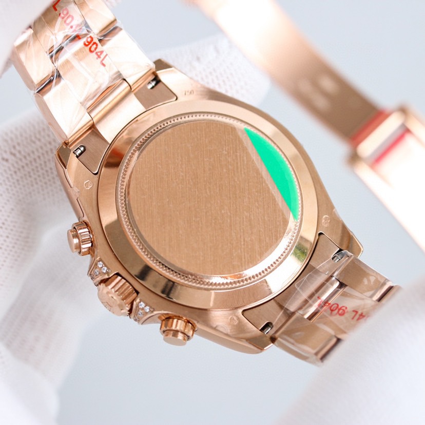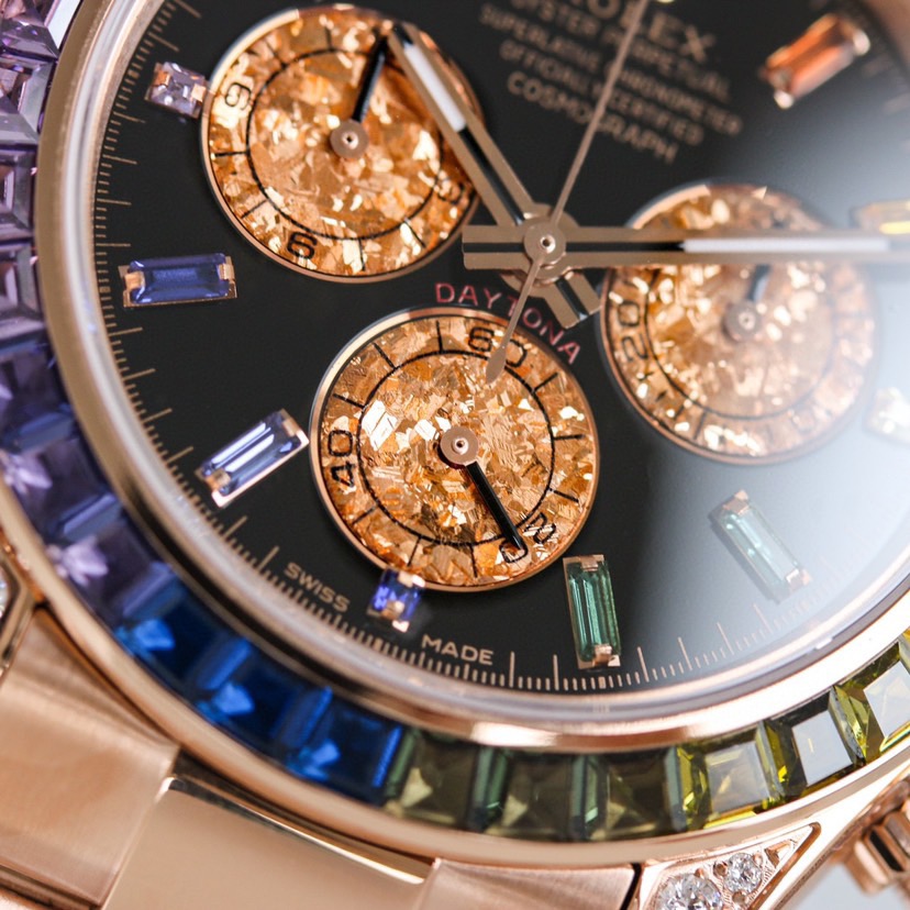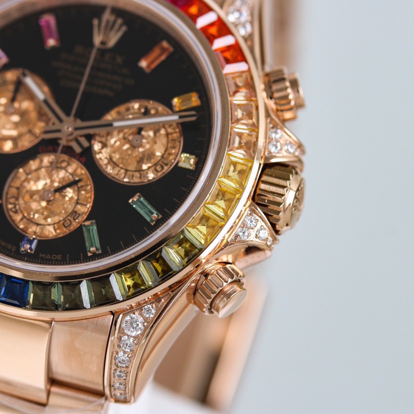 The case and strap of the “Second-generation Rainbow Daytona” are made of 316L stainless steel and polished. Each case case is processed with CNC to handle all details throughout the process, followed by manual polishing, grinding and inspection. The workmanship is meticulous. The Angle of the bezel and the size, quantity and color of the gemstones are consistent with the rainbow gradient effect. The glass uses a sapphire crystal with a clear effect. The movement adopts the 7750 automatic chronograph mechanical movement. The watch straps are available in either fully artificial diamond-encrusted solid steel straps OR imported fluororubber straps. They are equipped with Oyster-shaped safety clasp to prevent accidental opening, providing a comfortable wearing experience and being very easy to operate!