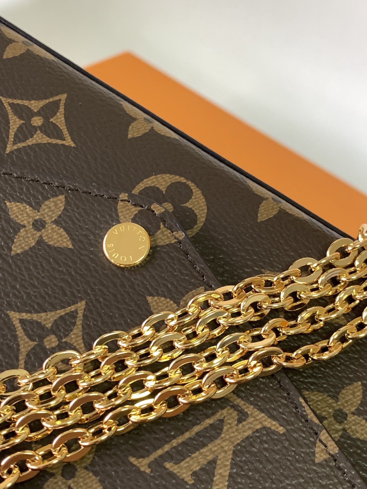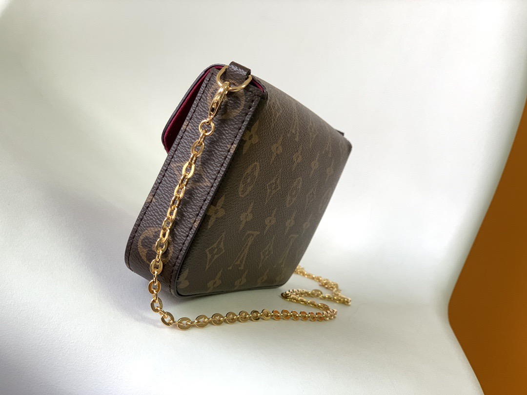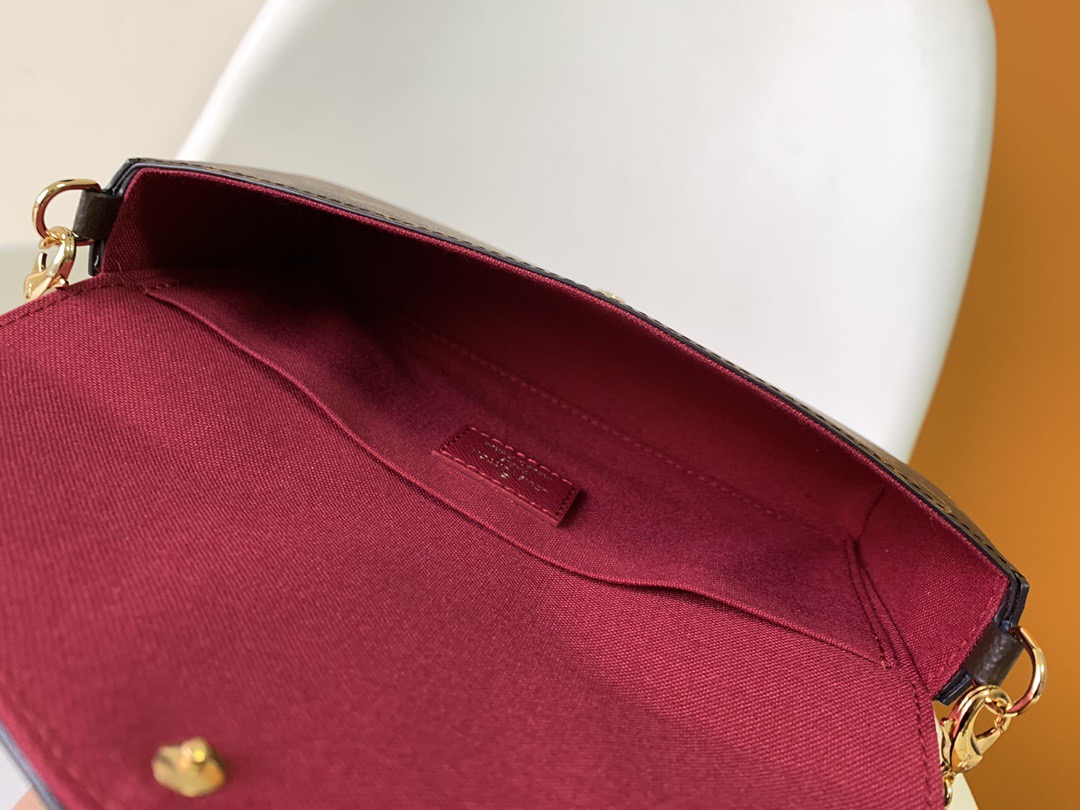 The M61276Pochette Felicie handbag is elegant and compact, with two detachable pockets inside. It is a fashionable choice for carrying and organizing your daily necessities. It is not merely a wallet. After removing the golden chain, it can also be used as a charming handbag or a small handbag. – 1 flat inner pocket – 2 detachable parts: a zippered pocket with a leather zipper and a flat-cover bag with 8 credit card slots – detachable shiny golden chain – button opening and closing – calfskin trim – fabric lining – shiny golden metal accessories.
